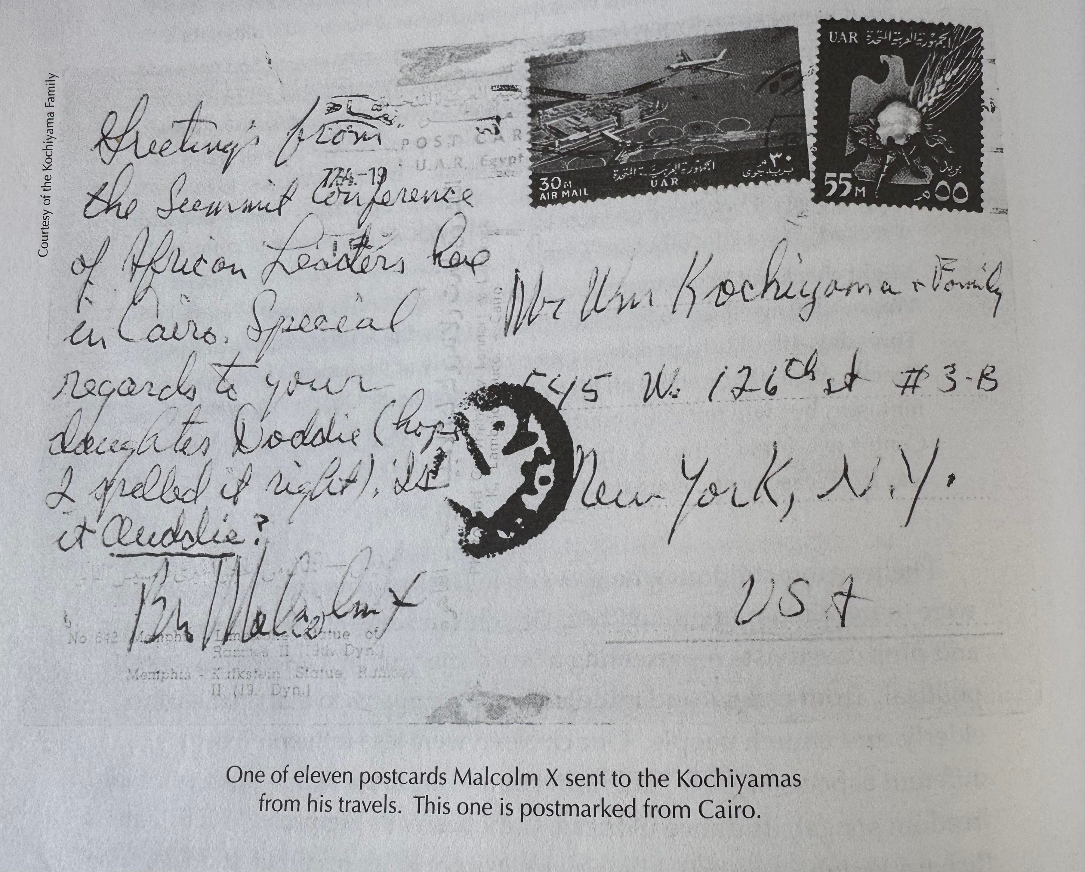 “A week later he left the country on a trip to Africa and the Middle East, and every few days we would receive a postcard from him...”10 In total, Yuri and her family would receive eleven postcards sent from the many places abroad that Malcolm visited. Those postcards are preserved today as part of the Yuri and Bill Kochiyama Papers, 1936-2003 archived at Columbia University. In one postcard, Malcolm writes: “I read all of your wonderful cards and letters of encouragement and I think you are the most beautiful family in Harlem.”11